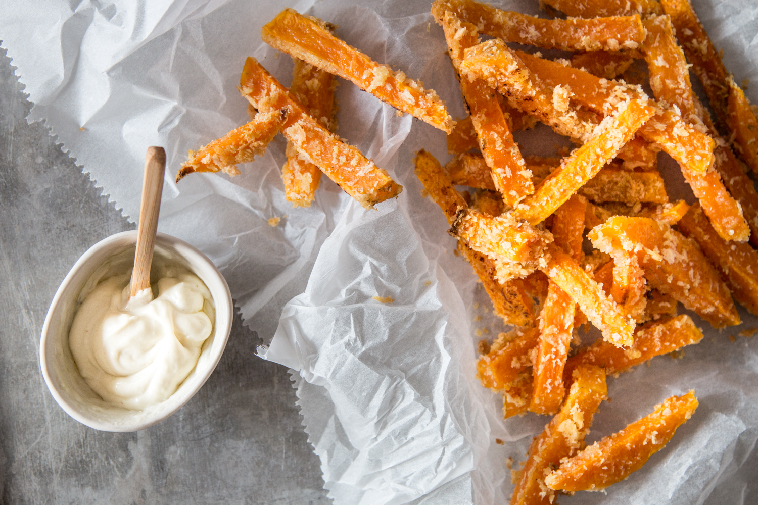 Dýňové hranolky vyndáme z trouby a podáváme s chilli majonézou.