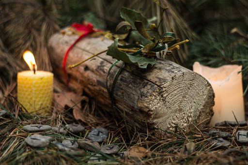 Opět se tu objevuje symbolika ohně - tentokrát symbolizuje slunce. Zapalovaly se posvěcená polena, která musela být darovaná nebo z vlastní zahrady. Po požehnání polena pivem nebo medovinou se ozdobilo stálezelenými rostlinami a na počest slunce se zapálilo. Hořet mělo až do Tří králů. Popel z polena se rozsypal po zahradě a poli pro dobrou úrodu a také se špetka popela dávala na půdu a do stájí. Aby byl dobytek požehnán sluncem a dům byl chráněn před blesky. Jak už jsme zmínili poleno se zdobilo stálezelenými rostlinami, ty symbolizovaly věčnost, a navíc rostliny s trny a jehlicemi chránily dům před uřknutím. Mezi tyto rostliny patřili túje, cypřiše, cedry ale také třeba jmelí. To navíc bylo považováno díky svým lepivým semenům jako mocný prostředek pro vyvolání či udržení svazku mezi dvěma osobami, posílilo jejich vzájemnou lásku. Také fungovalo jako talisman před zlými silami. Na Štědrý den Keltové nosili pod stromy venku dárky přírodě – původní tradice dnešních dárků pod stromečkem