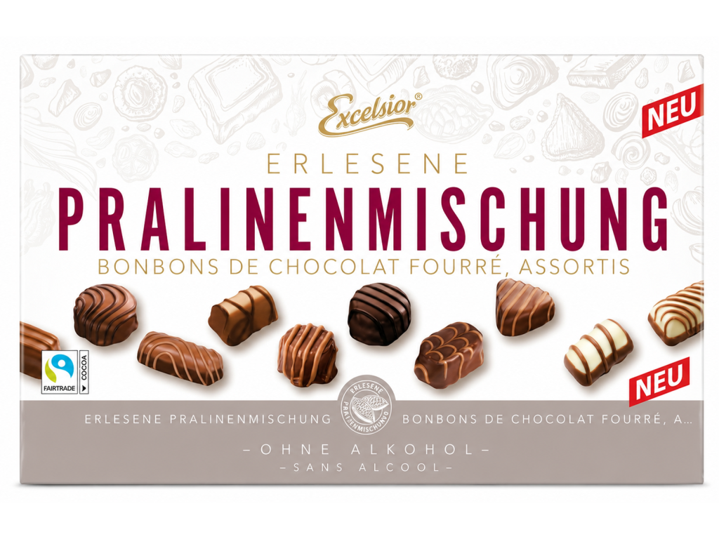 Excelsior je značka sladkostí určených pro německý maloobchod, která sází na atraktivní dárkový dojem, přístupnou cenu a chutě vhodné pro široké publikum. U této bonboniéry je to znát na kombinaci reprezentativního balení, různorodých náplní a univerzálního bezalkoholového konceptu. V Česku běžně nedostupné – výhradně na NěmeckýEshop.cz.