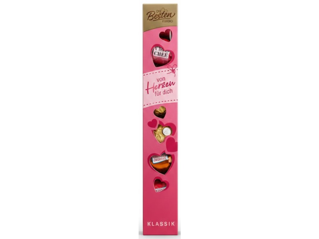 Hledáte elegantní a přitom upřímný dárek, kterým potěšíte každé srdce? Ferrero Die Besten „Von Herzen für dich“ je výběrová bonboniéra v nádherném valentýnském balení, která v sobě spojuje tři ikonické pralinky značky Ferrero: Ferrero Küsschen, Ferrero Rocher a Mon Chéri. Krabička ve tvaru srdce nejen krásně vypadá, ale především ukrývá lahodné chutě, které znají a milují miliony lidí po celém světě. Sladké gesto, kterým řeknete víc než slovy.