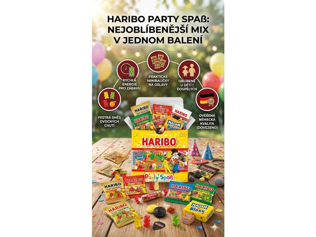 Haribo Party Spaß je směs bonbńů od značky Haribo, který je vytvořen speciálně pro oslavy a zábavné události. Tento produkt je skvělou volbou, pokud plánujete večírek, narozeninovou oslavu nebo jinou společenskou akci a chcete nabídnout svým hostům sladké dobroty.