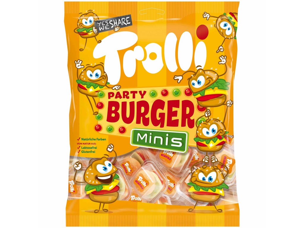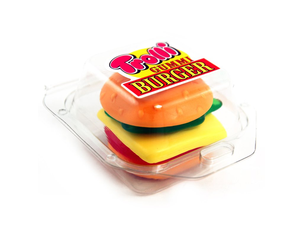 Originál ve formátu mini. Trolli Mini Burger je vždy po ruce, když vás přepadne hlad. Přibližně 2 cm vysoká "rychlá sladkost" se skládá ze dvou vrstev "houskového" pěnového cukru a "masové kuličky", "plátku sýra" a "salátového listu" z červené, žluté a zelené ovocné gumy. Jednotlivé vrstvy jsou naskládané na sobě a lze je od sebe snadno oddělit a užívat si je samostatně nebo je přeskládat. Díky tomu je svačina s tímto "cheeseburgerem" obzvlášť zábavná.