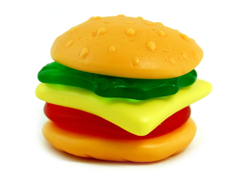 Jednotlivě balené a vícevrstvé miniburgery z pěnového cukru a ovocné gumy. Bez umělých barviv.
