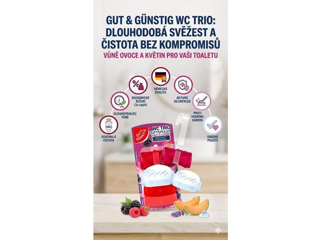 Přejete si, aby vaše toaleta byla vždy dokonale čistá a zároveň provoněná příjemnou, svěží vůní? WC závěs Gut & Günstig Fruit & Flower je přesně tím pomocníkem, který promění každodenní rutinu v pocit čistoty a komfortu. Kombinace ovocných a květinových tónů přináší jemnou, ale dlouhotrvající vůni, která eliminuje nepříjemné pachy a zanechá vaši koupelnu příjemně provoněnou. Díky tekutému gelovému složení působí účinně při každém spláchnutí – bez námahy a bez kompromisů.