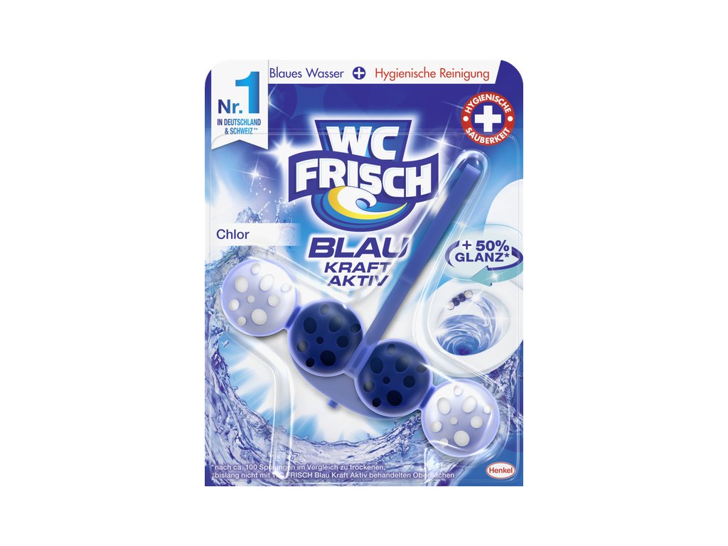 Dezinfekce a čištění: WC Frisch Blau Kraft Aktiv Chlor závěsný blok obsahuje aktivní složky chloru, které efektivně dezinfikují toaletní mísu a pomáhají eliminovat bakterie a nečistoty.