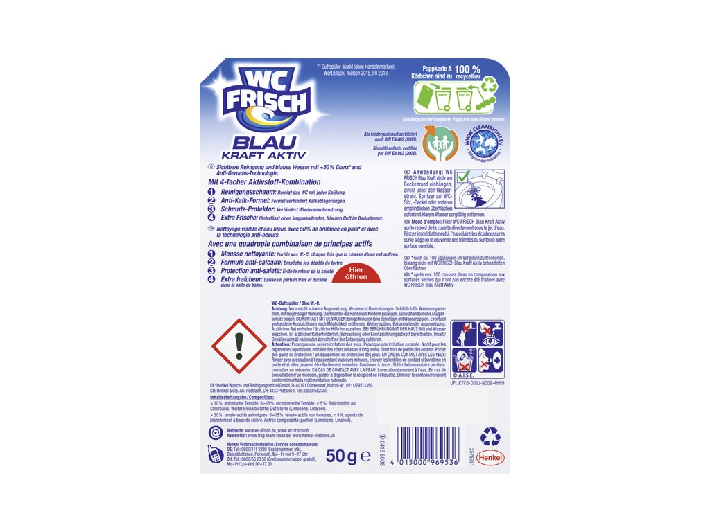 Dezinfekce a čištění: WC Frisch Blau Kraft Aktiv Chlor závěsný blok obsahuje aktivní složky chloru, které efektivně dezinfikují toaletní mísu a pomáhají eliminovat bakterie a nečistoty.