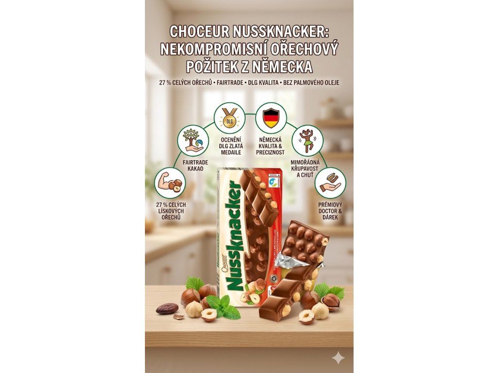 Choceur je privátní čokoládová značka německého diskontního řetězce Aldi. Navzdory příznivé ceně nabízí kvalitu srovnatelnou s prémiovými značkami — pravidelně získává ocenění od DLG a Stiftung Warentest. Nussknacker je jejich vlajková loď — jedna z nejprodávanějších čokolád v Německu. V Česku běžně nedostupná — výhradně na NěmeckýEshop.cz.