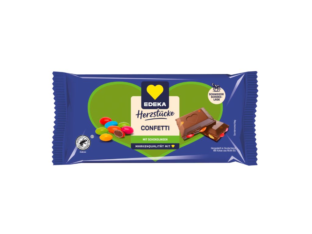 Chcete si dopřát něco sladkého, co vám vykouzlí úsměv už při prvním pohledu? EDEKA Herzstücke Confetti je kombinací jemné švýcarské mléčné čokolády a hravých barevných čokoládových lentilek, které dodávají každému soustu křupavý efekt a veselý vzhled. Hladká, krémová čokoláda se rozplývá na jazyku a barevné lentilky přinášejí příjemné zapraskání. Ideální sladkost ke kávě, pro rodinné chvíle i jako milé překvapení pro děti i dospělé.