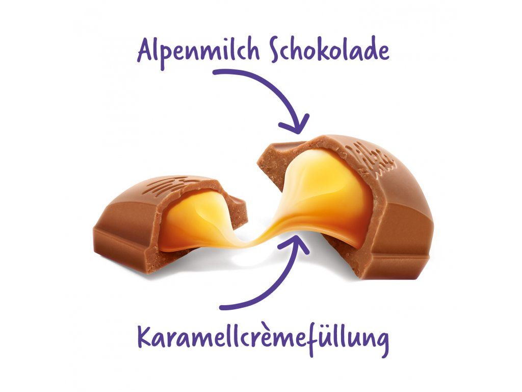 Zlatý karamelový sen. Milka Caramel je krémový karamel pod slupkou z jemné alpské mléčné čokolády. Nechte své chuťové pohárky podmanit plnou vůní tekutého středu, který slibuje krémově sladký zážitek z občerstvení. Mimochodem: Pokud tyčinku rozlomíte na jednotlivé kousky, vypadají díky svému zahnutému tvaru na talíři jako čokoládové bonbony - sladký hit pro večer u televize na gauči nebo při společenském hraní.