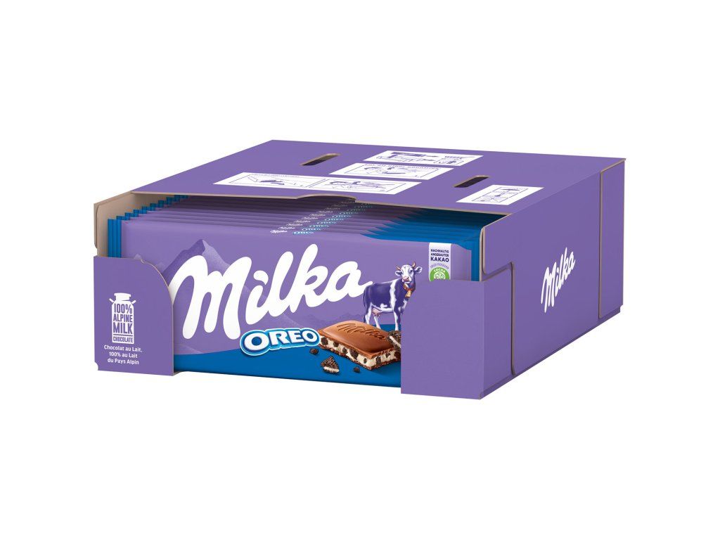 Milka Oreo čokoláda má charakteristický design, který je typický pro značku Milka - fialový obal s logem a slavnou kravičkou. Vnitřek čokolády je pak naplněn křupavými kousky Oreo sušenek. Jedná se o kombinaci mléčné čokolády a vanilkového krému s kousky kakaových sušenek.
