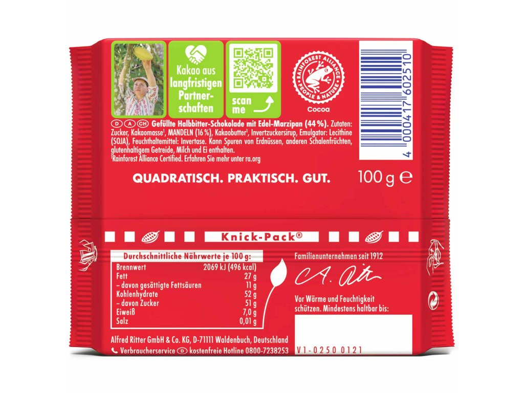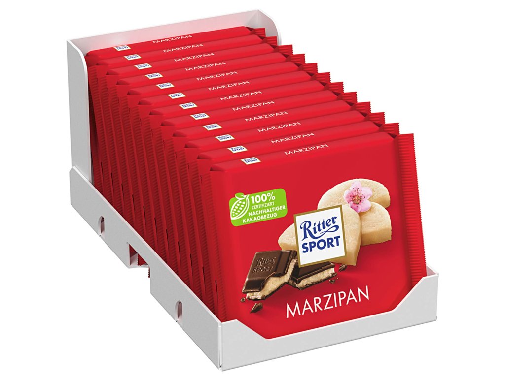 Běžné čokolády s marcipánem často obsahují umělé aroma a levnější přísady, které se originálnímu marcipánu zdaleka nevyrovnají. Ritter Sport Marzipan se odlišuje použitím vybraných mandlí a certifikovaného kakaa z udržitelných zdrojů. Výsledkem je čokoláda, která nabízí autentickou chuť mandlového marcipánu a jemně nahořklý čokoládový kontrast – bez kompromisů v kvalitě.