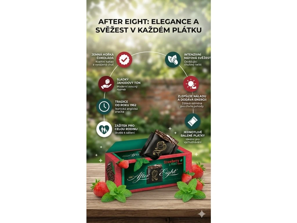 Výtečné a originální mátové čokoládové tabulky s mátovou náplní. 21 jednotlivě balených čokoládových tabulek - tenkých plátků s náplní z máty peprné a potahem z hořké čokolády.