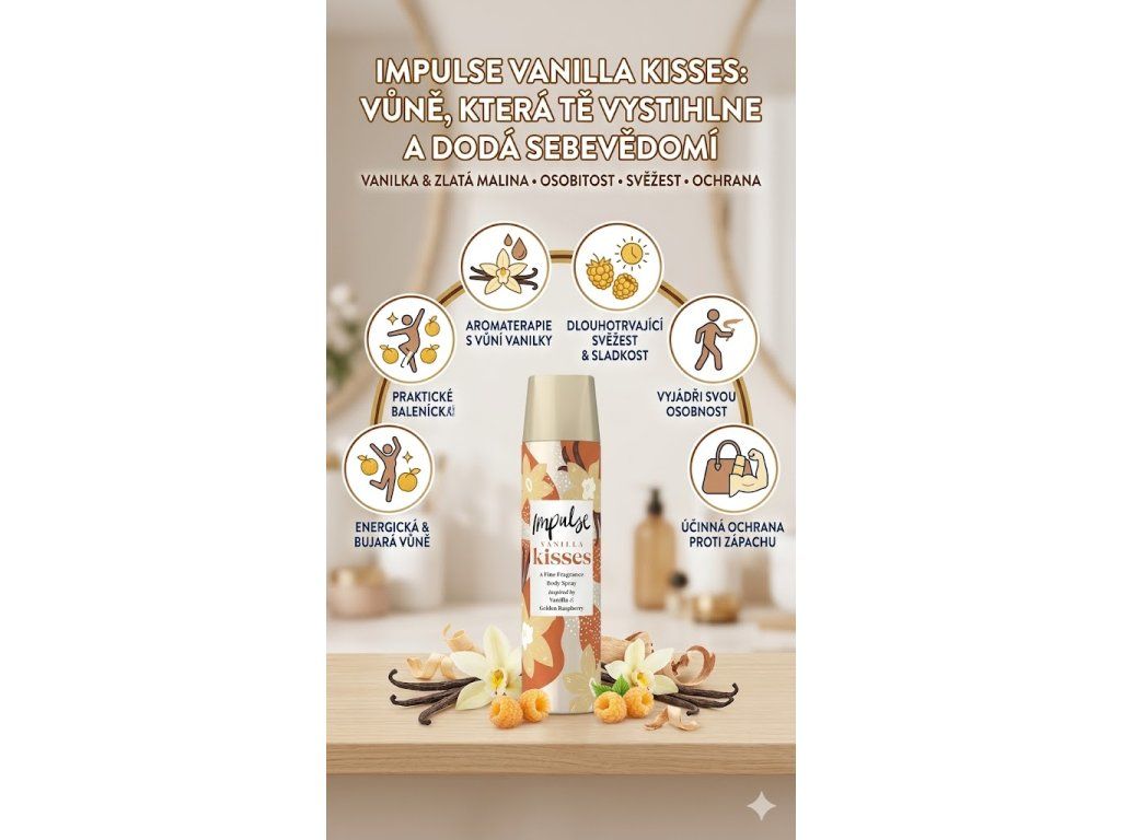 Vanilkové polibky vám zajistí svěží a voňavý den. Stejně jako všechny tělové vůně Impulse nabízí bezpečnou 24hodinovou ochranu svěžesti bez hliníku. Pohodlně zabalený v 75 ml plechovce, která se zaručeně vejde do každé kabelky.