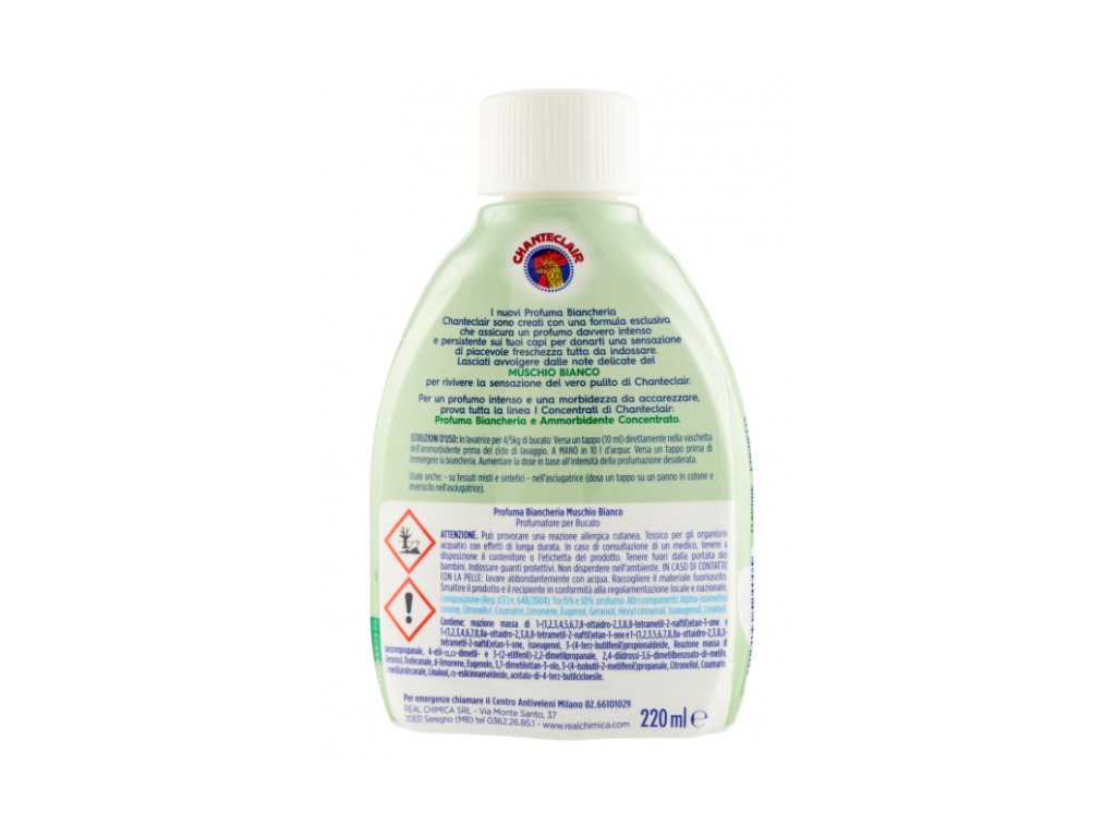 Chanteclair I Concentrati Muschio Bianco je luxusní koncentrovaný parfém na prádlo, který dodá vašemu oblečení a textiliím nezaměnitelnou svěžest a jemnou vůni bílého pižma. Tento exkluzivní parfém se vyznačuje dlouhotrvající a intenzivní vůní, která zůstává na prádle i několik dní po vyprání. Parfém proniká hluboko do vláken textilií, zanechává je svěží a voňavé a zároveň dodává prádlu jedinečný nádech čistoty a elegance. Je vhodný pro všechny druhy tkanin, včetně jemných materiálů, jako je vlna, kašmír, syntetika nebo mikrovlákno. Ideální je i pro použití v sušičce, kde jeho vůně ještě více vynikne a zvýrazní pocit čistoty a svěžesti prádla.