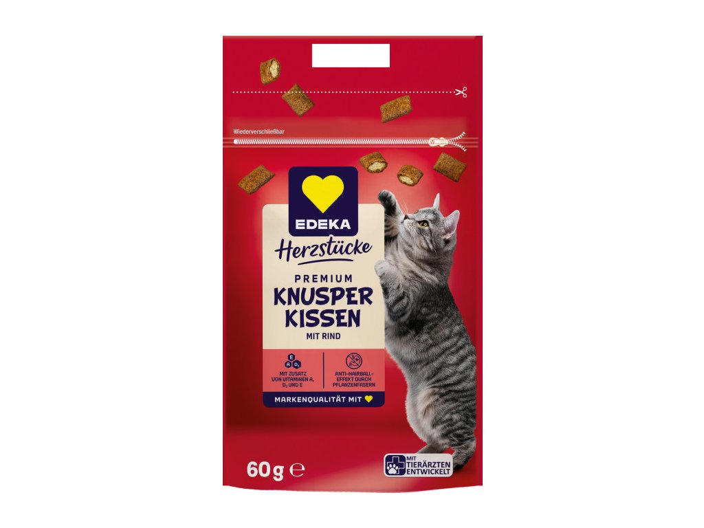 S křupavými polštářky EDEKA s hovězím masem můžete své kočce nabídnout lahodnou a obohacující svačinu. Křupavá textura a jemná chuť zajišťují zvláštní chuťový zážitek. Efekt proti srsti navíc podporuje trávení vaší kočky. Užijte si šťastné chvíle se svým chlupatým kamarádem a odměňte ho lahodnými křupavými polštářky od EDEKA.