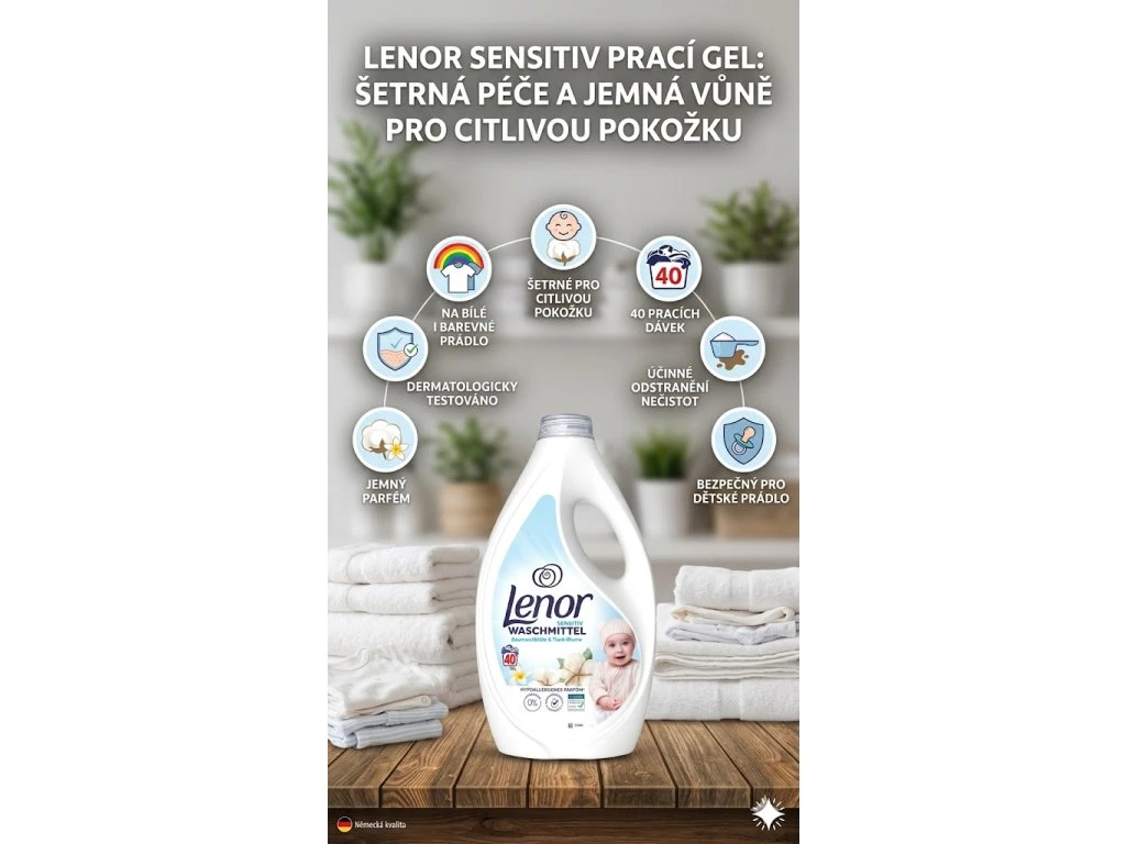 Objevte Lenor Sensitiv prací gel, který je speciálně vyvinutý pro šetrné, ale účinné praní všech druhů prádla – bílé i barevné. Díky dermatologicky testované formuli je ideální volbou pro lidi s citlivou pokožkou a také pro dětské oblečení.