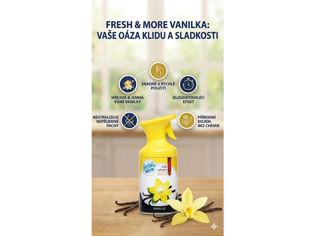 Fresh & More Vanilla není jen obyčejný osvěžovač vzduchu – je to malý detail, který dělá velký rozdíl. Dopřejte si vůni, která vás bude vítat pokaždé, když přijdete domů.