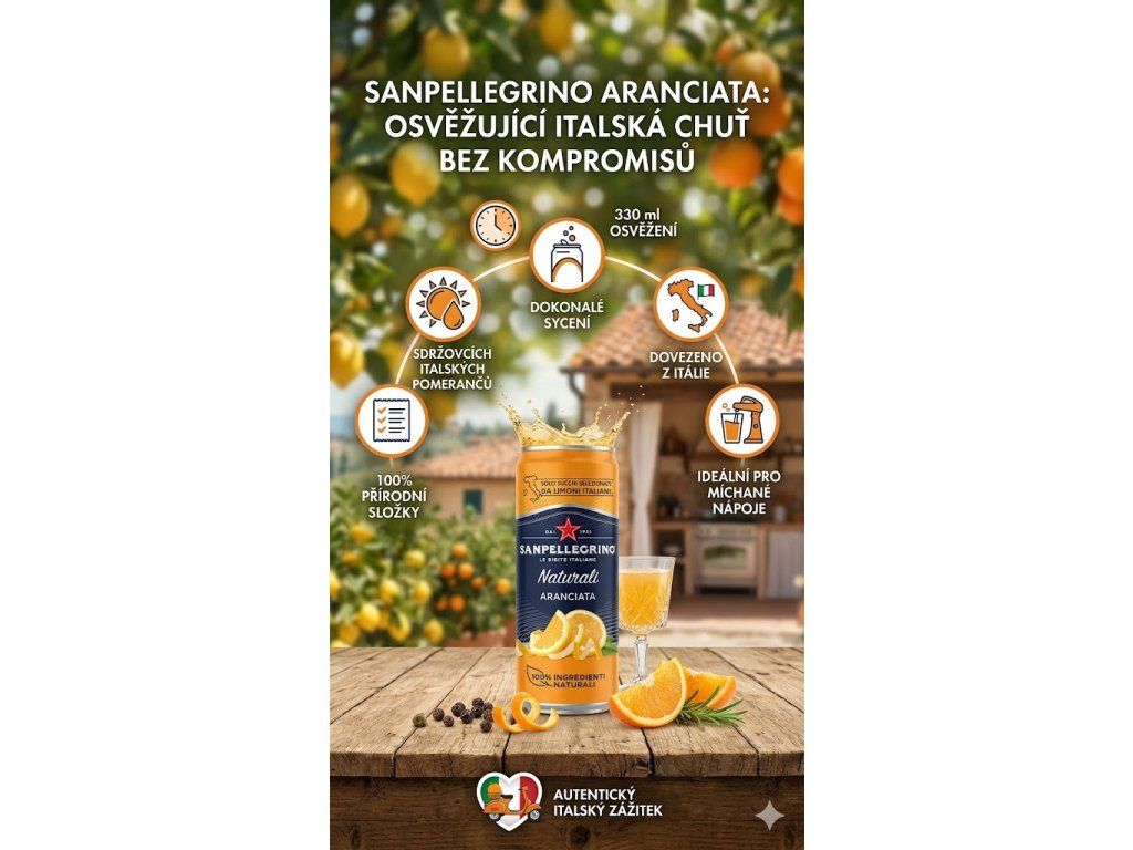 - Ať už si užíváte horký letní den, nebo jen hledáte povzbuzující nápoj, Sanpellegrino Naturali Aranciata je ideální volbou. Vychutnejte si tento pikantní, lahodný nápoj samostatně nebo jako osvěžující přísadu do koktejlů a míchaných nápojů. Ponořte se do světa italské chuti se Sanpellegrino Aranciata!