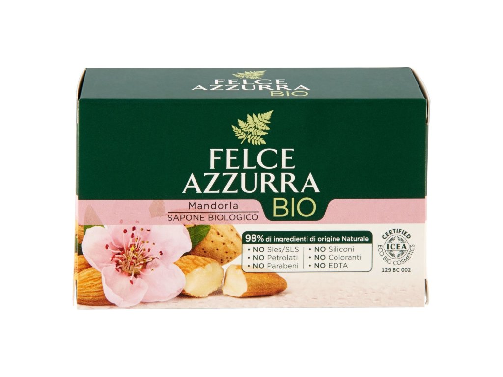 S jemným peelingovým účinkem! BIO mandlové mýdlo Felce Azzurra od Paglieri jemně čistí pokožku a je ideální pro každodenní použití. Mýdlo s lahodnou vůní mandlí bylo vyvinuto, vyrobeno a certifikováno v souladu s nejpřísnějšími normami pro bio kosmetiku. A organická mandlová mouka, kterou obsahuje, má jemný exfoliační účinek a zajišťuje pokožku jemnou na dotek.