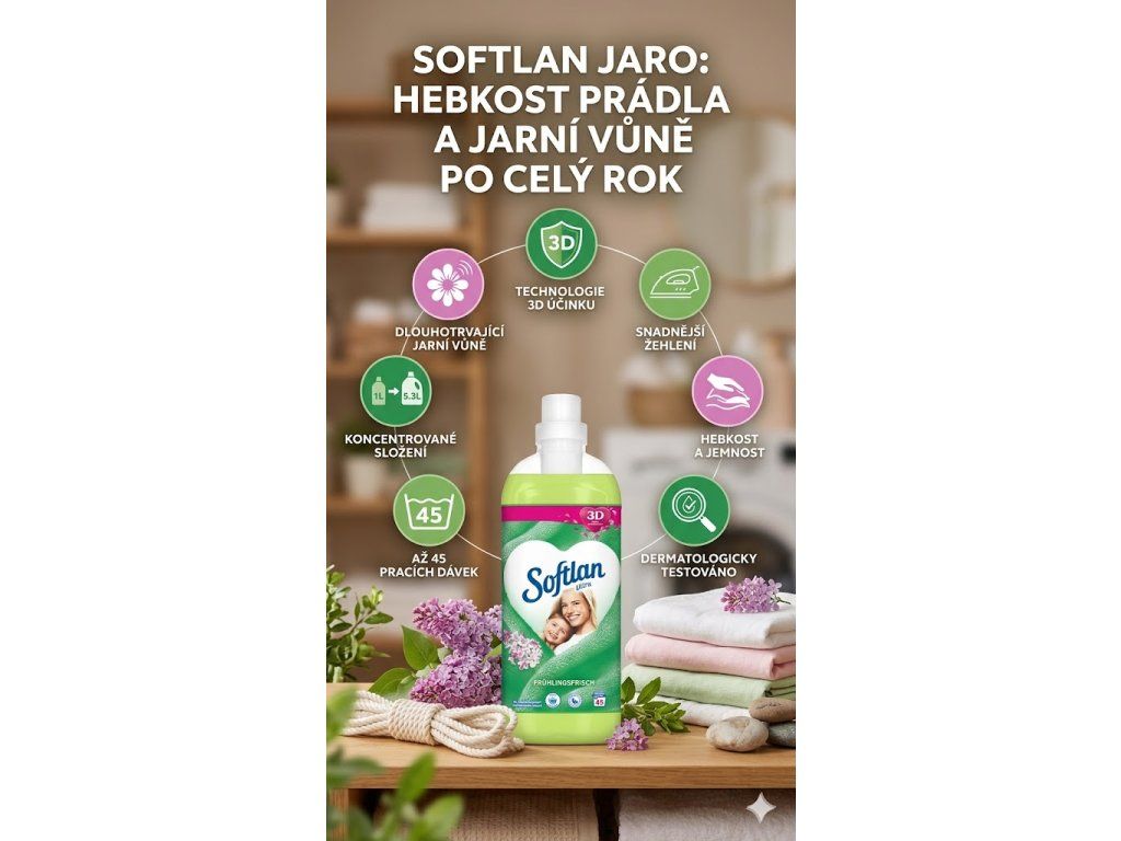 Softlan 3D Ultra aviváž s jarní svěžestí je víc než jen změkčovač – je to každodenní rituál, který spojuje péči, vůni a komfort. Udělejte si z praní příjemný zážitek a nechte jaro vstoupit do vašeho šatníku!