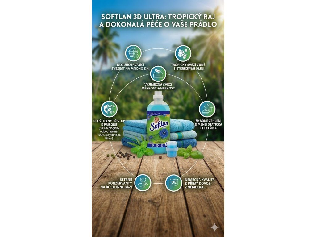 Přejete si prádlo, které je nejen hebké, ale navíc provoněné vůní, co vám zvedne náladu? Softlan 3D Ultra Tropische Frische je aviváž nové generace s inovativní 3D formulí a obsahem přírodních éterických olejů. Přináší dlouhotrvající svěží vůni tropického ráje a zároveň pečuje o vaše oblečení i přírodu. Tato prémiová aviváž byla vyvinuta pro německý trh a díky svému složení vám poskytne nejen měkké, ale i snadno žehlitelné prádlo s menší statickou elektřinou.