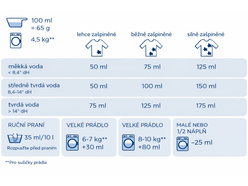 - Pro ruční praní použijte 35 ml na 10 litrů vody a důkladně rozpusťte před přidáním prádla