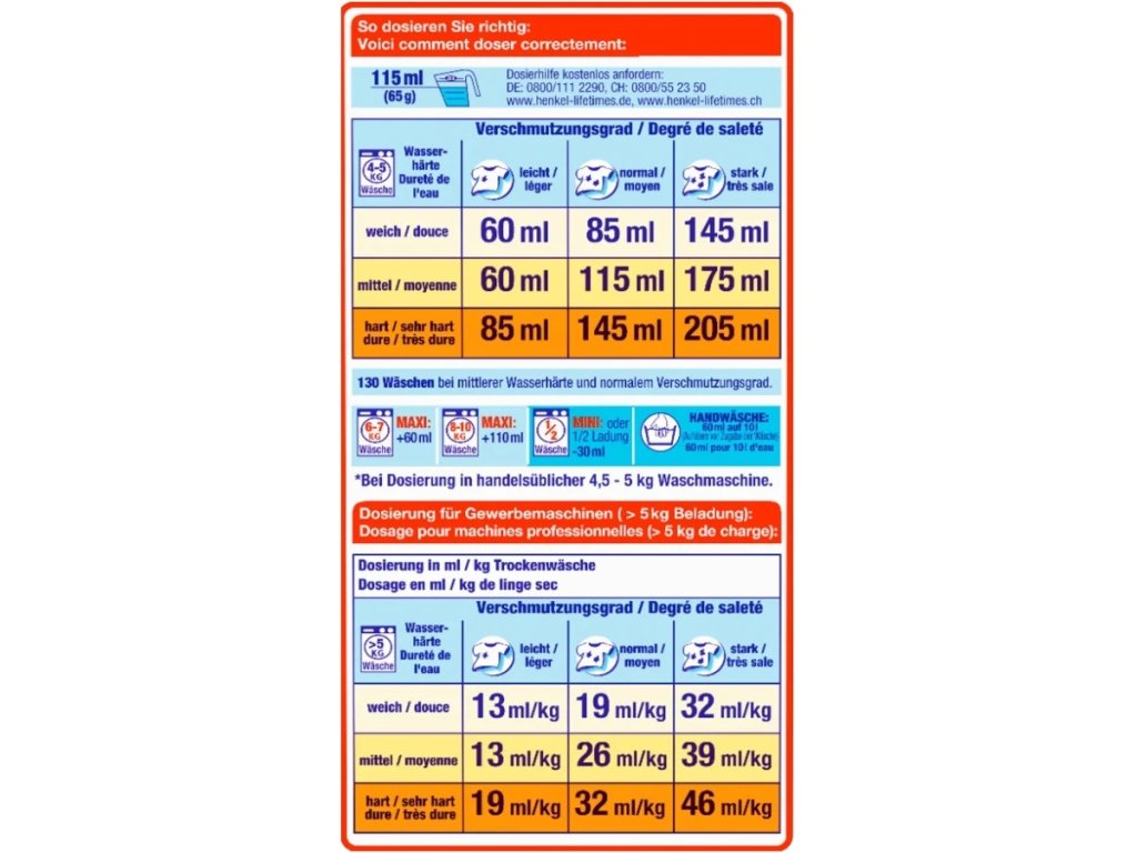Silné složení s enzymy, aktivními odstraňovači skvrn a ochrannými látkami proti šednutí, zajišťuje účinné a přitom šetrné praní. Vysoký obsah aktivních pracích složek znamená nižší spotřebu na dávku a tedy i delší výdrž balení. Vhodný i pro alergiky citlivé na zbytky pracího prostředku – při správném dávkování se skvěle vymáchá.