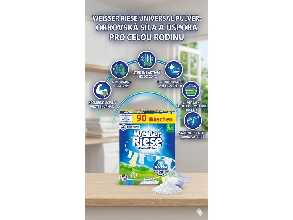 Weisser Riese univerzální prací prášek v balení s hmotností 4,5 kg nabízí komplexní péči o vaše prádlo a je určen pro až 90 praní. Tento prací prášek má několik vlastností a výhod, které jej dělají atraktivním pro různé potřeby v oblasti prádla: