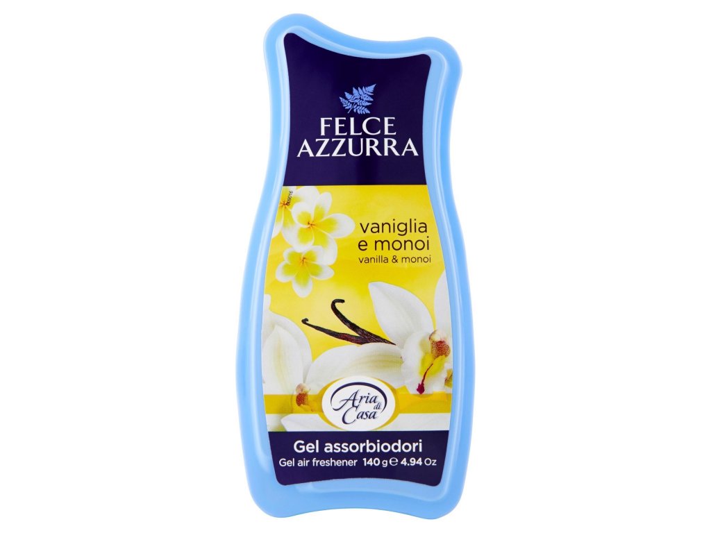 Felce Azzurra Osvěžovač vzduchu Gel Vanilka a Monoi olej 120 g je zahalující gelový osvěžovač vzduchu, který spojuje jemné tóny pomerančových květů a vanilkových lusků s příjemnými ovocnými tóny medu a kokosu. Tato kombinace vytváří smyslnou vůni, která vás zavádí do tajemných obzorů a umožní vám snít o vzdálených místech.