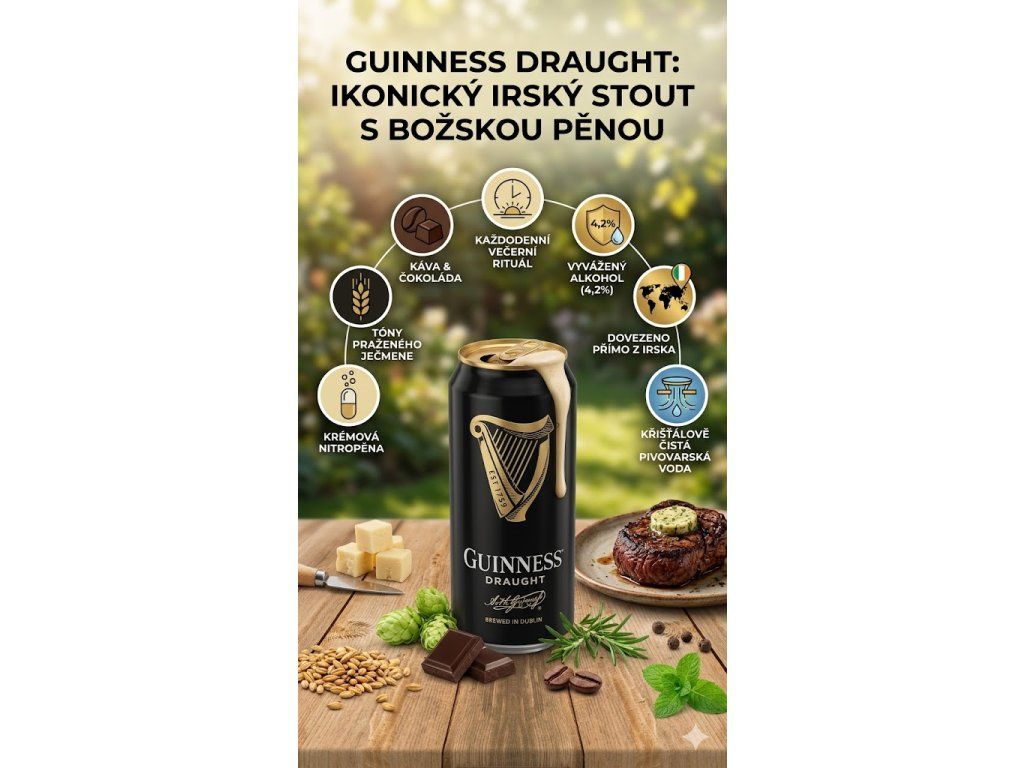 Nechte se unést tradicí, chutí a kvalitou, kterou si Guinness udržuje už přes 250 let. Guinness Pivo 4,2 % je víc než nápoj – je to symbol poctivosti, vkusu a charakteru. Dopřejte si zážitek, který obohatí každý okamžik.
