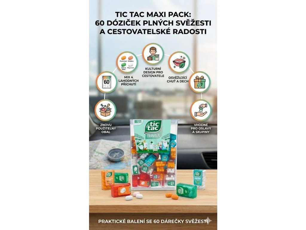 60 mini dóziček Tic Tac: Osvěžení v kompaktním formátu – vždy po ruce.