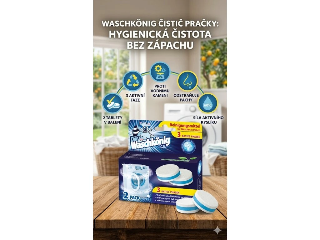 Zdá se vám, že vaše pračka už neperete tak dobře jako dřív? Cítíte nepříjemný zápach nebo zůstávají na prádle stopy po pracích prostředcích? Čistící tablety Waschkönig s trojfázovým účinkem jsou přesně to, co potřebujete! Odstraňují vodní kámen, zbytky pracích prostředků i nepříjemné pachy, a to díky síle aktivního kyslíku. Stačí jediná tableta a vaše pračka bude opět zářivě čistá, hygienicky svěží a funkčně výkonná.