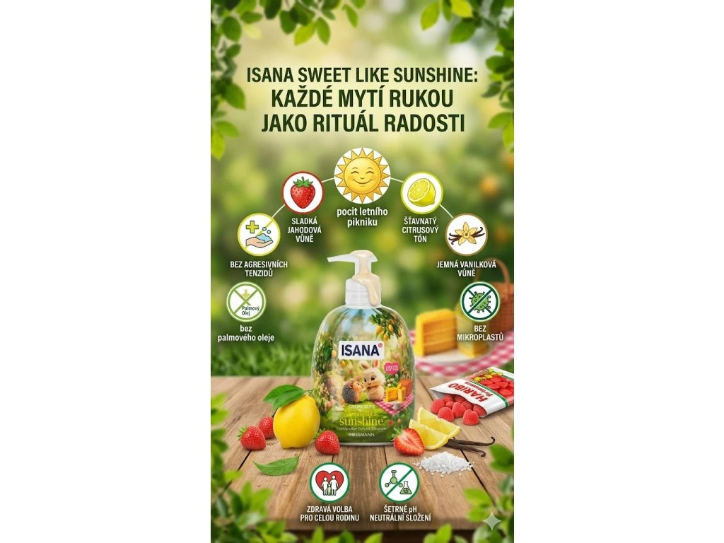 I malé věci mohou zpříjemnit den. ISANA Sweet Like Sunshine je důkazem, že i obyčejné mytí rukou může být příjemným zážitkem plným vůně, jemnosti a pohody.