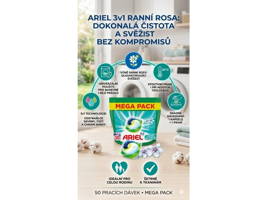 Ariel gelové kapsle 3v1 Ranní rosa universal jsou praktickým a efektivním řešením pro vaše praní. Každá kapsle obsahuje tři koncentrované složky, které společně zajišťují výjimečné výsledky praní. Tyto kapsle jsou navrženy tak, aby zvládly i ty nejnáročnější úkoly, a to s maximální účinností. S kapslemi Ariel 3v1 získáte sílu odstranění skvrn, čistotu prádla a zářivé barvy v jediném kroku. S vůní ranní rosy přinášejí svěžest a čistotu do každého praní.