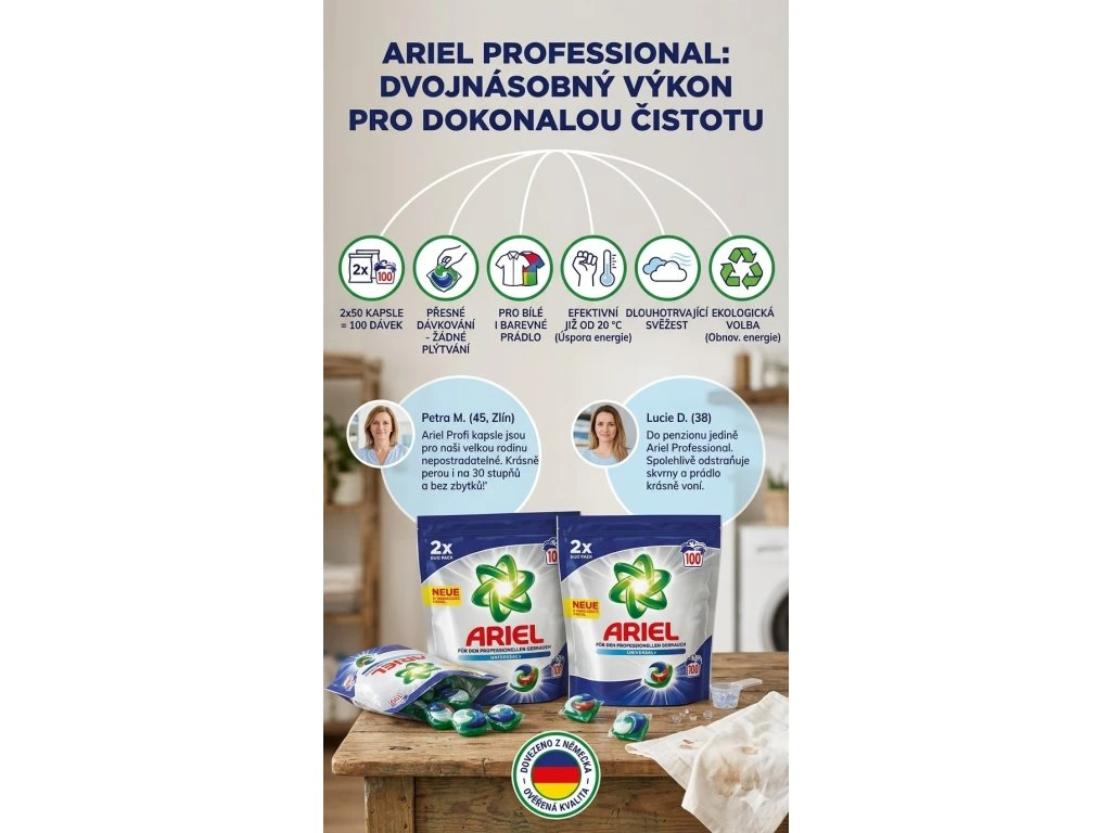 Ariel Professional All-in-1 Universal+ kapsle poskytují dokonalou čistotu, svěžest a hygienu – a to i při nízkých teplotách od 20 °C. Každá kapsle obsahuje přesně odměřenou dávku pracího gelu, který odstraňuje skvrny už při prvním praní a zároveň chrání vlákna i barvy prádla.