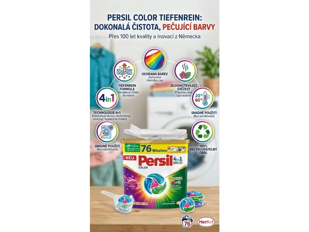 🌀 Persil Color DISCS 4v1 představují novou generaci pracích kapslí, které spojují sílu hloubkového čištění, péči o barvy, dlouhotrvající svěžest a odstranění skvrn v jediném kroku.