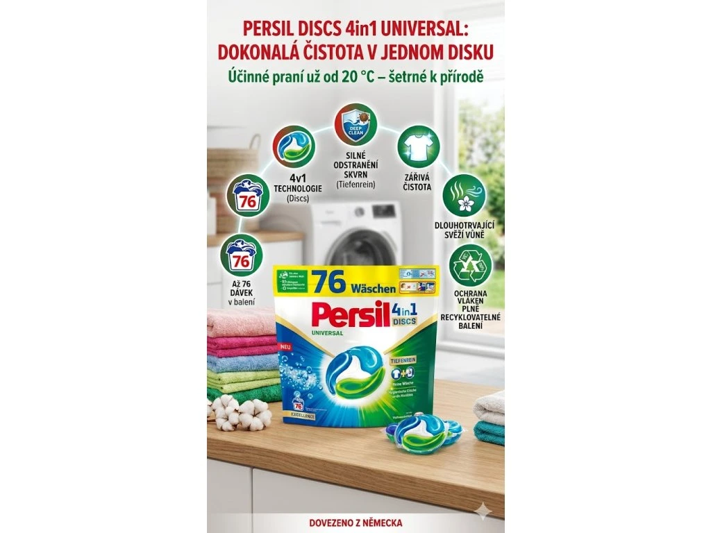 Hledáte prací prostředek, který dokonale odstraní skvrny, oživí prádlo a zároveň nezatíží planetu? Persil Universal DISC 4in1 je inovativní řešení pro každodenní praní, které kombinuje čtyři účinky v jediné kapsli. Díky technologii Deep Clean Plus proniká hluboko do vláken, efektivně odstraňuje i odolné skvrny a zanechává dlouhotrvající svěžest. Navíc funguje už od 20 °C – ideální pro úsporné praní. A co víc? Balení je plně recyklovatelné, takže přispíváte k ochraně životního prostředí.