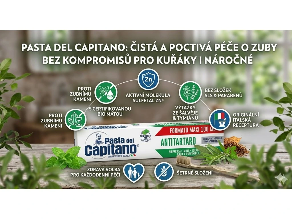 Hledáte zubní pastu, která si poradí s náročnější ústní hygienou, osvěží dech a zároveň nabídne pocit opravdu důkladné čistoty? Pasta del Capitano Antitartaro pro kuřáky s BIO mátou je přesně ten typ produktu, který dokáže proměnit každodenní čištění zubů v poctivý pečující rituál. Tato italská zubní pasta byla vyvinuta pro potřeby lidí, kteří chtějí svým zubům a dásním dopřát víc než jen běžnou péči. Pomáhá v boji proti zubnímu kameni, plaku i nepříjemnému dechu, a díky své výrazně svěží mátové chuti zanechává v ústech čistý, upravený a dlouhotrvající pocit. Ocení ji zejména kuřáci, ale také každý, kdo má rád intenzivní svěžest, antibakteriální účinek a pečlivě promyšlené složení bez zbytečně agresivních látek.