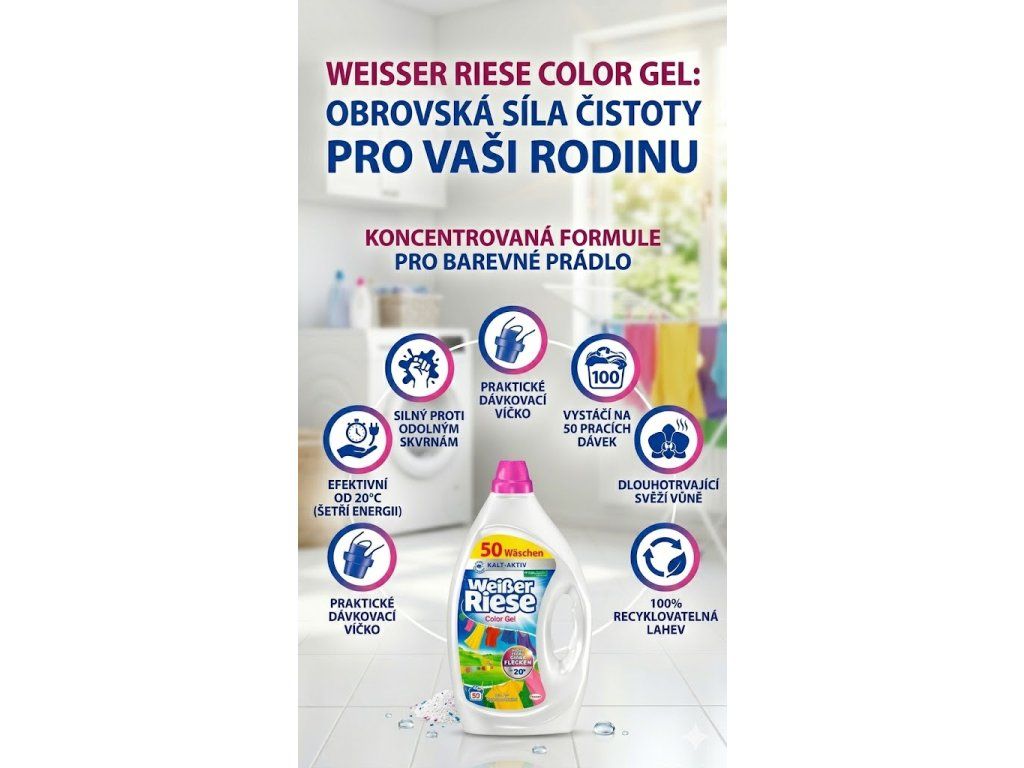 - Vysoká účinnost: Weisser Riese Color prací gel se vyznačuje mimořádnou účinností při odstraňování skvrn, zajišťuje hygienickou čistotu a zářivou čistotu prádla.