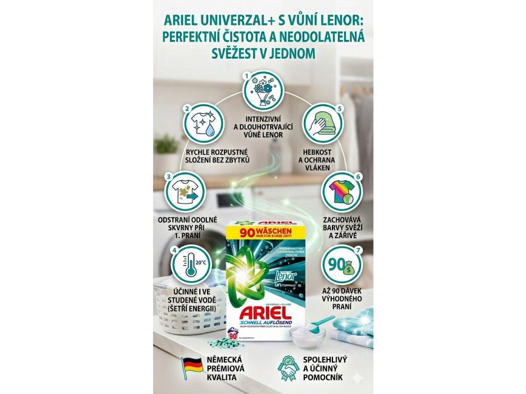 Ariel je jednou z nejdůvěryhodnějších značek pracích prostředků v Evropě. Proslulý účinností, technologickým pokrokem a důrazem na kvalitu, Ariel je oblíbenou volbou milionů domácností. V kombinaci s vůní Lenor Unstoppables přináší prémiový zážitek z praní, který běžně v českých obchodech nenajdete – dovezeno přímo z Německa.