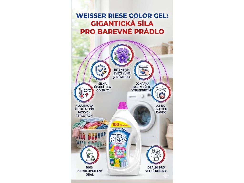 Obrovská nálož prádla? Žádný problém! S pracím gelem Weißer Riese Color zvládnete i ty největší výzvy v domácnosti – snadno, spolehlivě a s německou precizností. Tento extra výkonný gel na barevné prádlo přináší hloubkovou čistotu, ochranu barev a intenzivní svěžest, a to již od 20 °C. Díky koncentrovanému složení vystačí až na 100 praní, takže šetří nejen vaši peněženku, ale i životní prostředí.