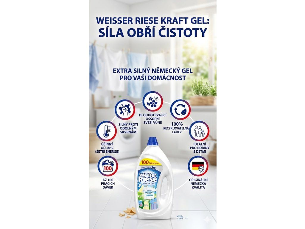 Trápí vás odolné skvrny na prádle, ale nechcete dělat kompromisy v účinnosti ani spotřebě? Pak je tu Weißer Riese Universal Kraft Gel – extra silný prací gel z Německa, který si poradí i s tím nejšpinavějším prádlem a přitom je mimořádně úsporný. 100 pracích dávek v jedné lahvi a efektivní praní již od 20 °C – to je skutečně silný pomocník pro každou rodinu. Nejenže skvěle pere, ale také zanechává prádlo voňavé a svěží jako po usušení na sluníčku.