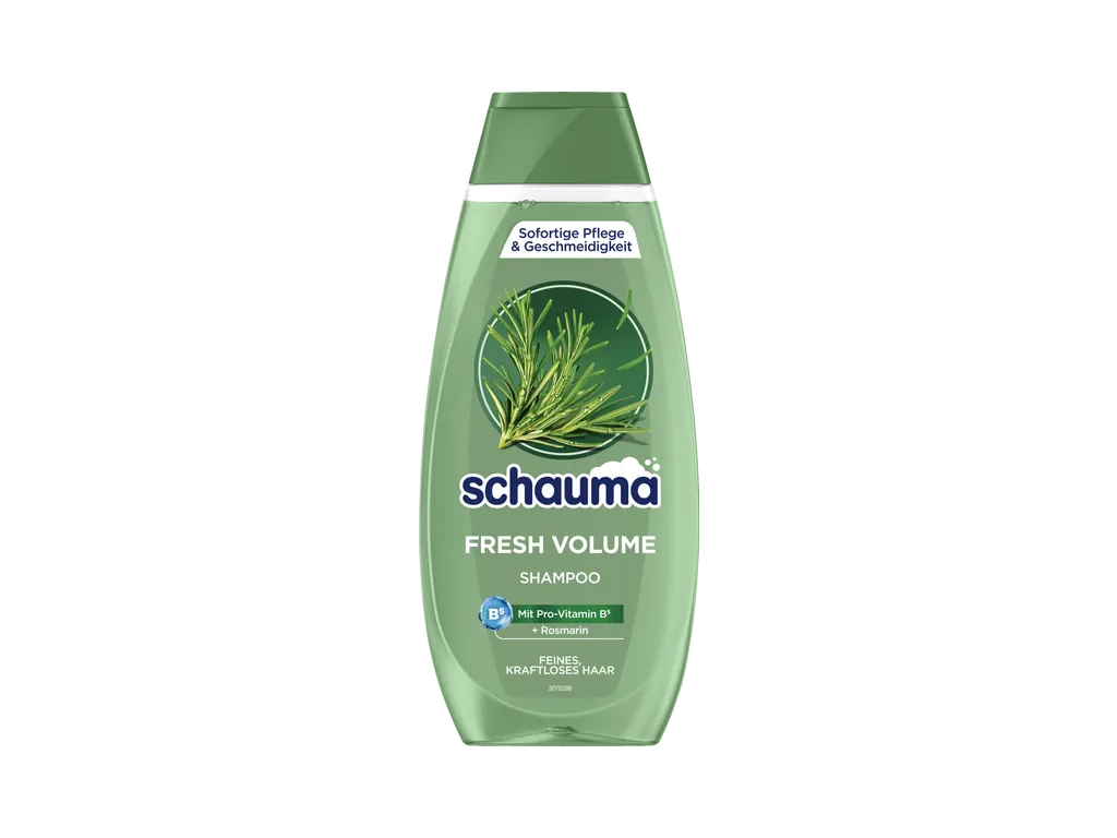 Šampon Schauma Fresh Volume Shampoo s rozmarýnem je speciálně vyvinutý pro jemné a slabé vlasy. Osvěžuje a posiluje vlasovou linii, dodává vlasům větší pružnost a objem a znatelně větší texturu. Veganské složení zajišťuje zdravě vypadající vlasy plné objemu a vitality. Šampon je navíc dodáván v ekologických obalech, které tvoří z velké části recyklovaný plast.