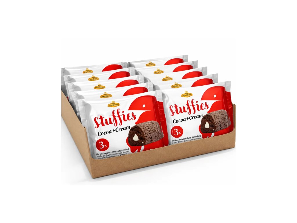 Zatímco běžné mini dortíky dostupné v supermarketech často obsahují levné rostlinné tuky, náhražky a přemíru umělých aromat, Stuffies sází na vyváženou chuť, kvalitní kakaový základ a jemně smetanový krém, který nepůsobí přeslazeně. Výsledkem je harmonická chuť, která neurazí ani náročné jazýčky a kterou ocení i ti, kteří sladkosti běžně nevyhledávají.