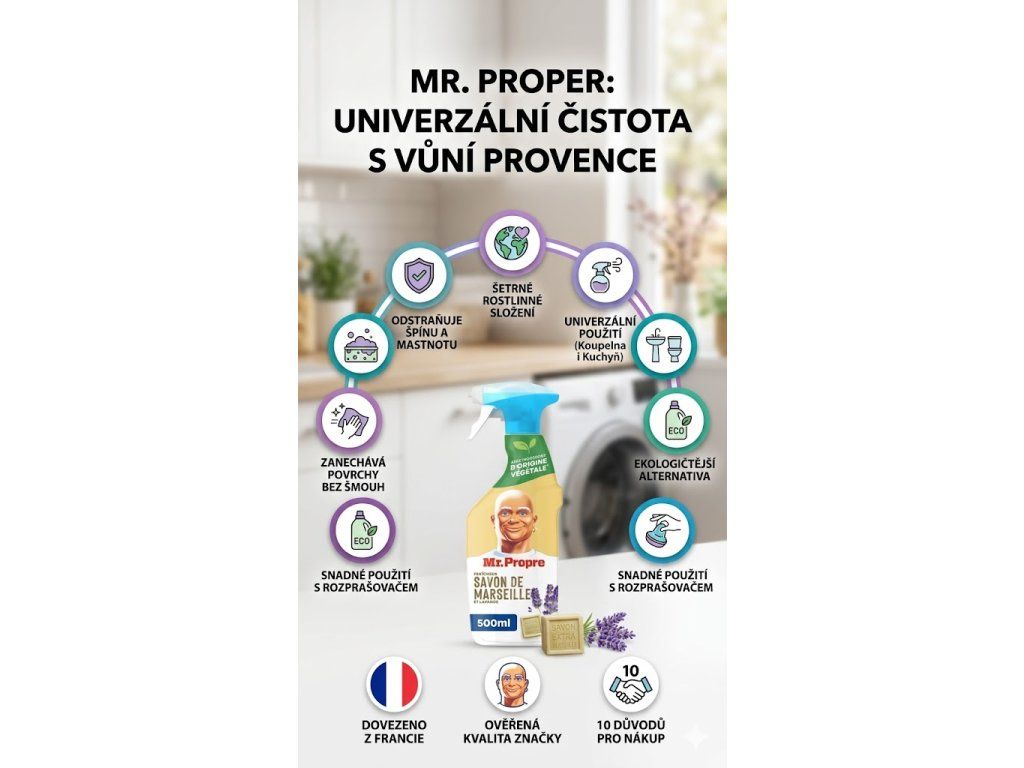 Hledáte univerzální čistič, který nejen spolehlivě odstraní mastnotu a špínu, ale zároveň provoní váš domov příjemnou vůní čistoty? Mr. Proper přichází s osvědčenou silou v nové variantě s marseillským mýdlem a levandulí – vůní, která evokuje svěžest a klid jihofrancouzských domovů. Šetrné složení s rostlinnými ingrediencemi účinně čistí kuchyňské plochy, koupelny, podlahy i spotřebiče – a to bez kompromisů v účinnosti.