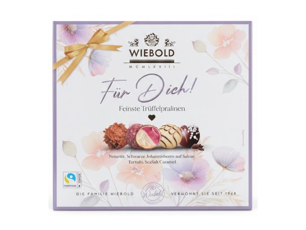 Za touto dárkovou krabičkou stojí značka Wiebold – rodinná firma s tradicí od roku 1968, která je synonymem pro čokoládové umění v té nejčistší podobě. V každé pralince najdete pečlivě vybrané suroviny, smetanovou jemnost, pravé máslo i kakaové máslo. Ušlechtilé náplně s pravým ovocem, smetanou a přírodním aroma tvoří harmonickou souhru s dokonalou čokoládovou polevou. Navíc je použité kakao certifikované Fairtrade, takže nejen mlsáte, ale i podporujete férový obchod.