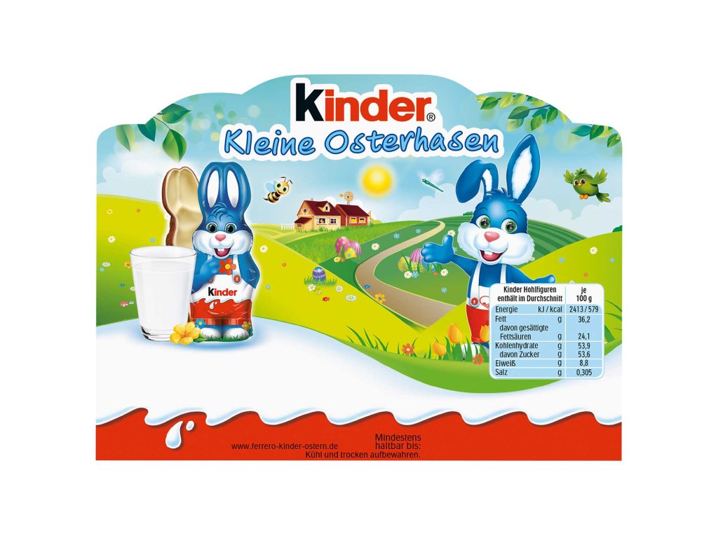 kinder čokolády "Malí velikonoční zajíčci" se setkávají s nadšením u dětí i dospělých. Vrstva jemného mléčného krému se přimyká k dutému tělu z mléčné čokolády a v ústech se lahodně rozpouští. Roztomilí velikonoční zajíčci navíc vypadají mimořádně dekorativně a šťastnému nálezci vytvoří zářící oči ve velikonočních hnízdech.