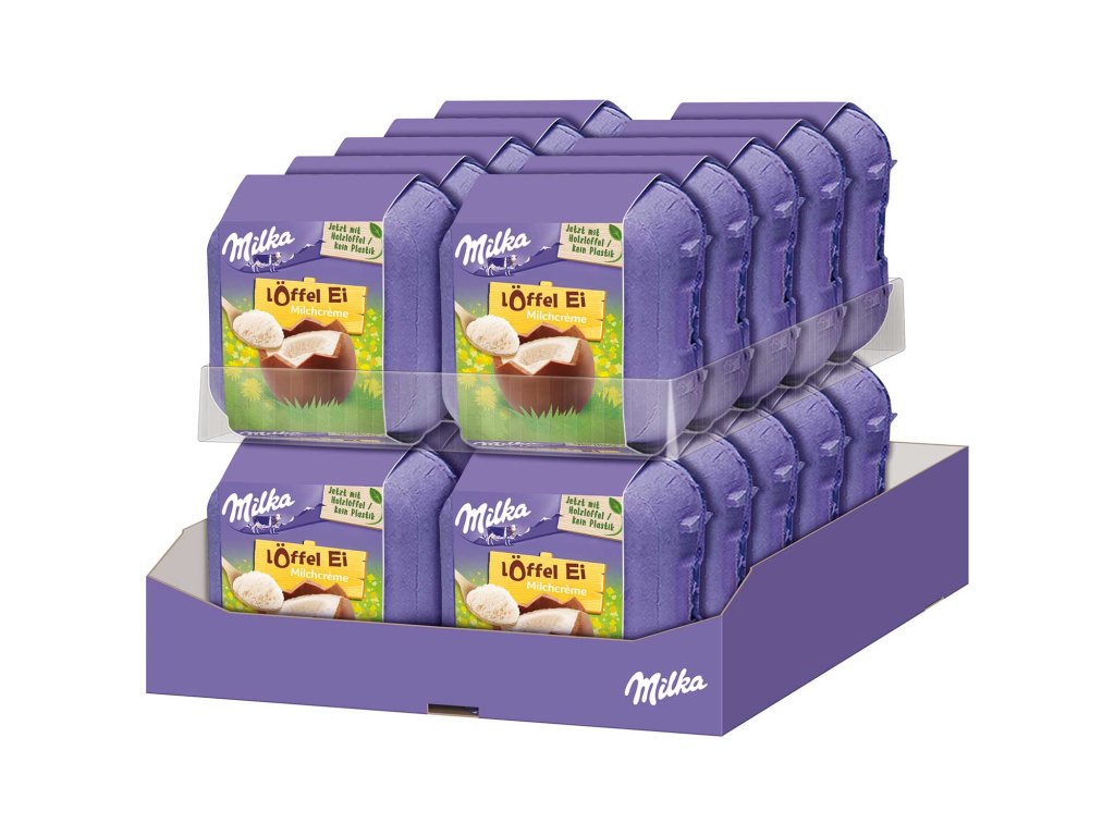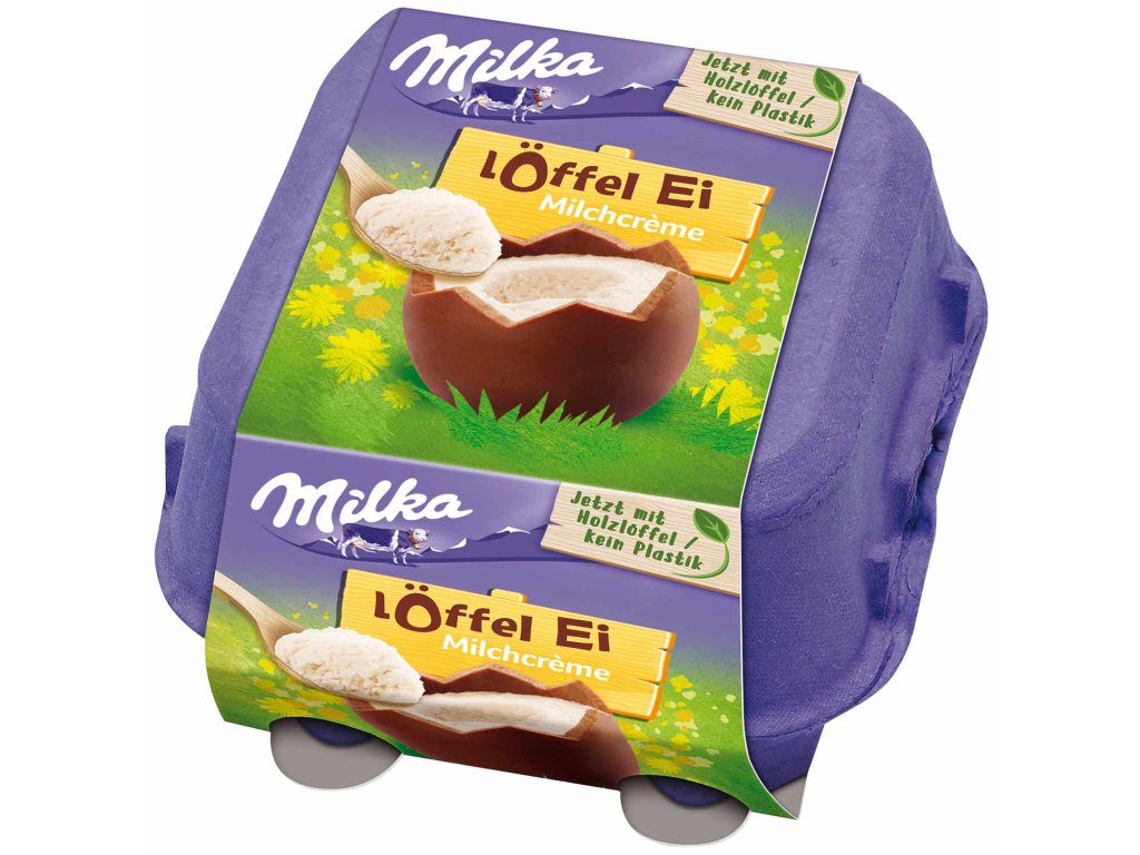 Představte si velikonoční vajíčko, které neukousnete – ale vychutnáte si ho pomalu lžičkou. Přesně takový zážitek přinášejí Milka Löffel Eier s mléčným krémem. V roztomilém balení připomínajícím klasický karton na vejce se ukrývají čtyři čokoládová vajíčka z jemné alpské čokolády Milka, která jsou naplněná sametově hladkým mléčným krémem. Každé vajíčko se otevře a vy si můžete jeho krémovou náplň vychutnat pomocí přiložených dřevěných lžiček. Je to hravý a zároveň luxusní způsob, jak si dopřát sladké velikonoční potěšení.
