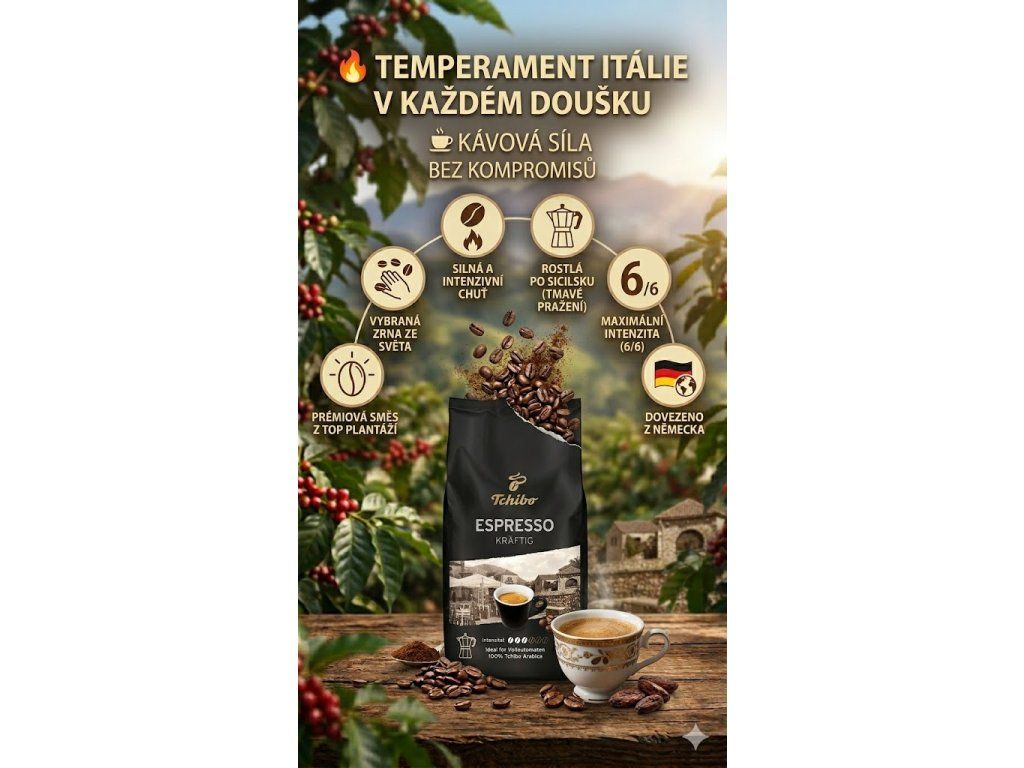 Máte rádi silné espresso s intenzivní chutí a sametovou cremou? Tchibo Caffè Espresso Kräftig vás okouzlí svou jižanskou energií a nekompromisní silou. Tato prémiová směs pečlivě vybraných kávových zrn je pražena podle tradiční sicilské metody, díky čemuž vzniká skutečně intenzivní, plné espresso s minimální kyselostí a bohatou pěnou. Ať už si připravíte espresso, silný americano nebo cappuccino, budete mít pocit, že sedíte v italské kavárně – jen na stisknutí tlačítka.